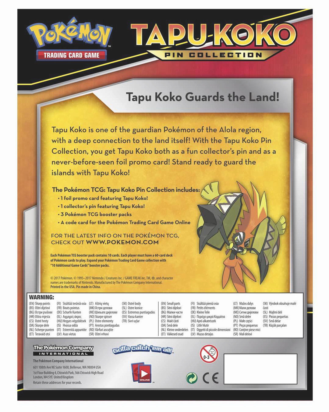 The Pokémon TCG: Tapu Koko Pin Collection includes: