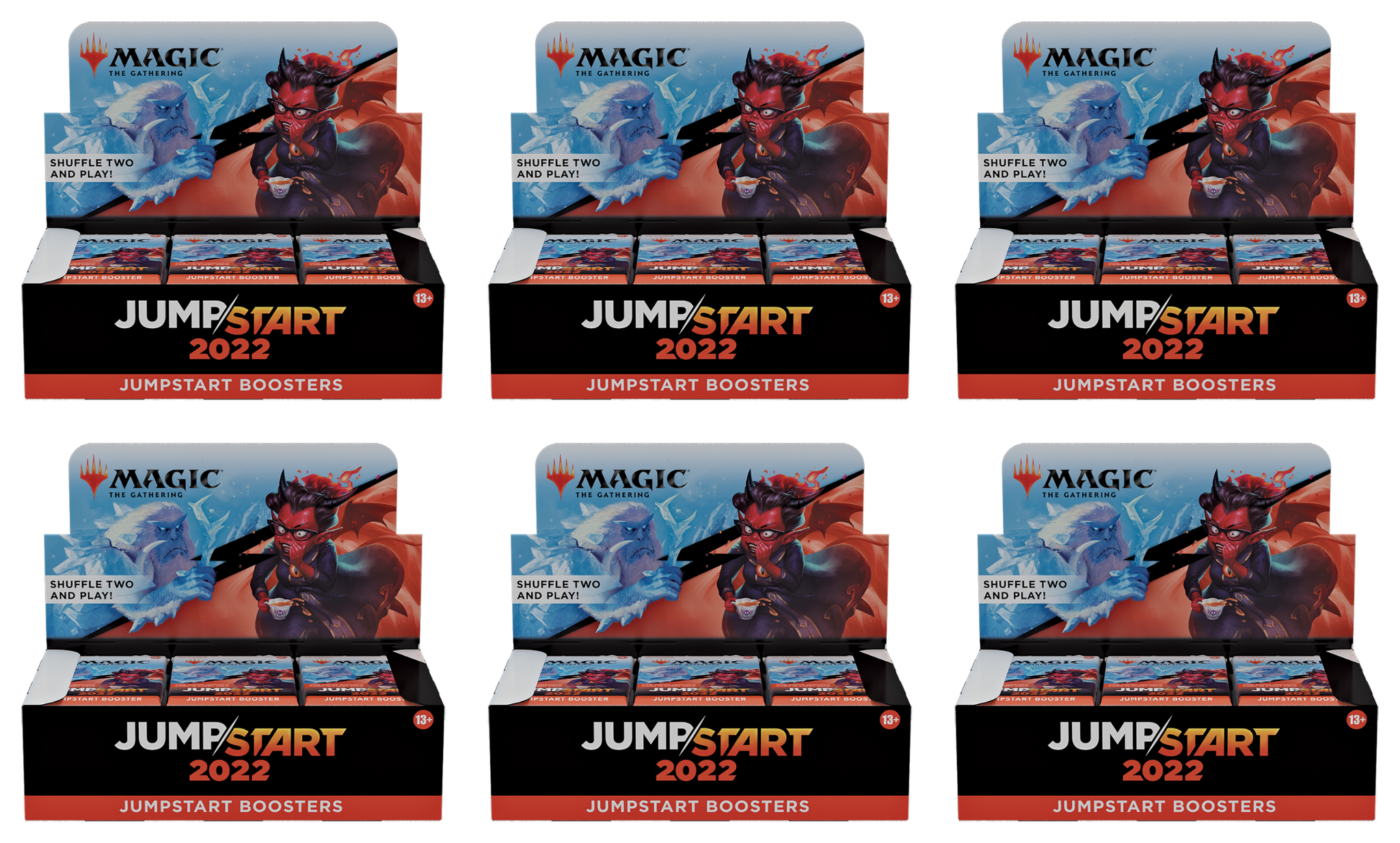 The Jumpstart 2022 Booster Box contains 24 Magic: The Gathering Jumpstart Boosters. Each Jumpstart 2022 Booster contains 1 insert indicating the pack's theme and 20 Magic cards revolving around that theme, including 1 card with anime-inspired art, a total of 1–2 cards of rarity Rare or higher, and all the lands you need to play. To play with even more wild theme combos, Jumpstart 2022 Boosters can be combined with packs from any other Jumpstart product.